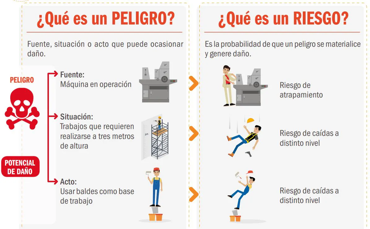 El peligro se refiere a una fuente o situación que puede causar daño, mientras que el riesgo es la probabilidad de que ese daño ocurra. Por lo tanto, al evaluar un entorno de trabajo, debemos identificar los peligros y analizar los riesgos asociados.